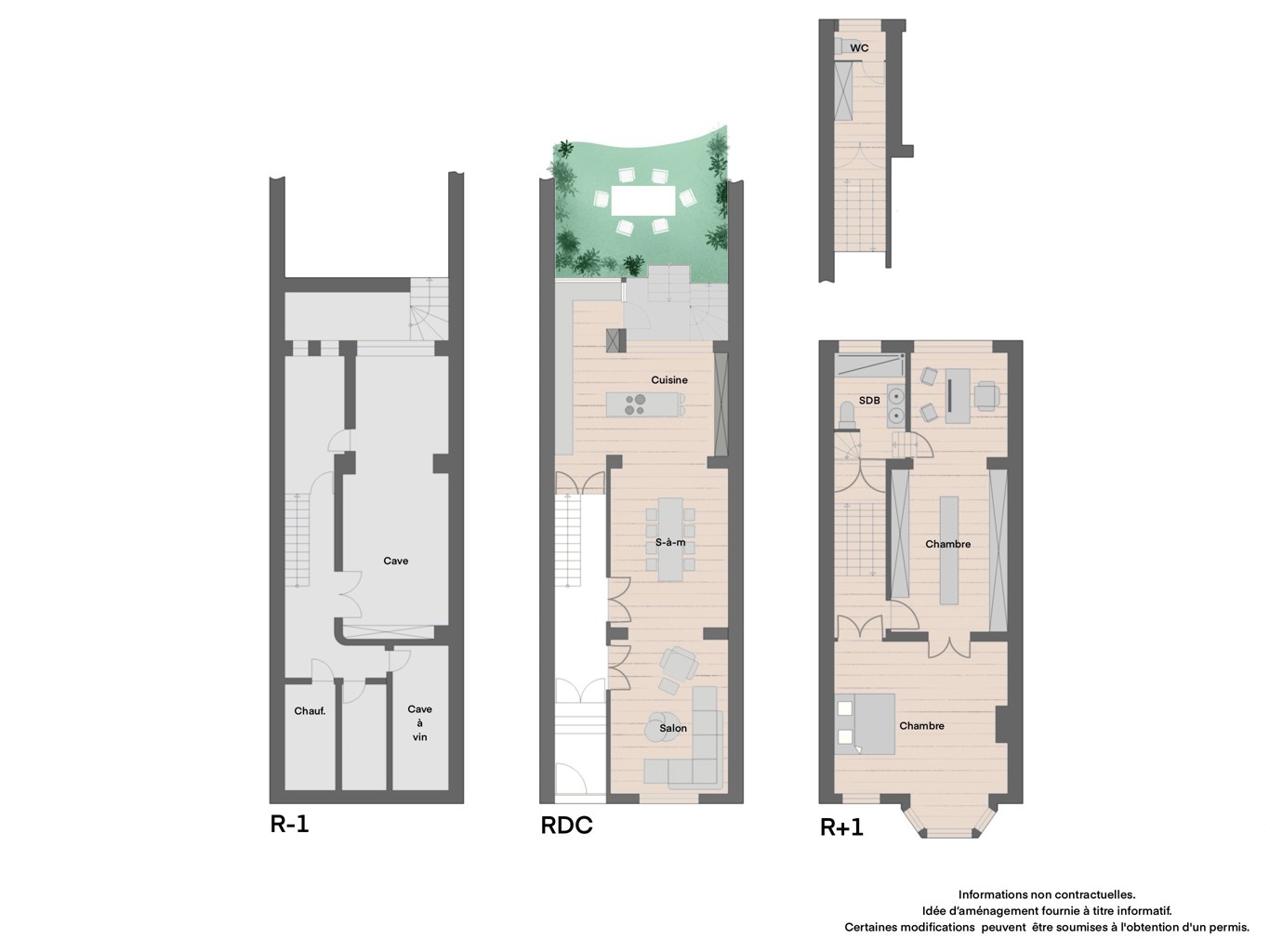 - Sous-sol: plateau de 91m² divisé en différentes caves de rangement, chaufferie, cellier et pièce principale donnant accès à un patio arrière remontant vers le jardin;
