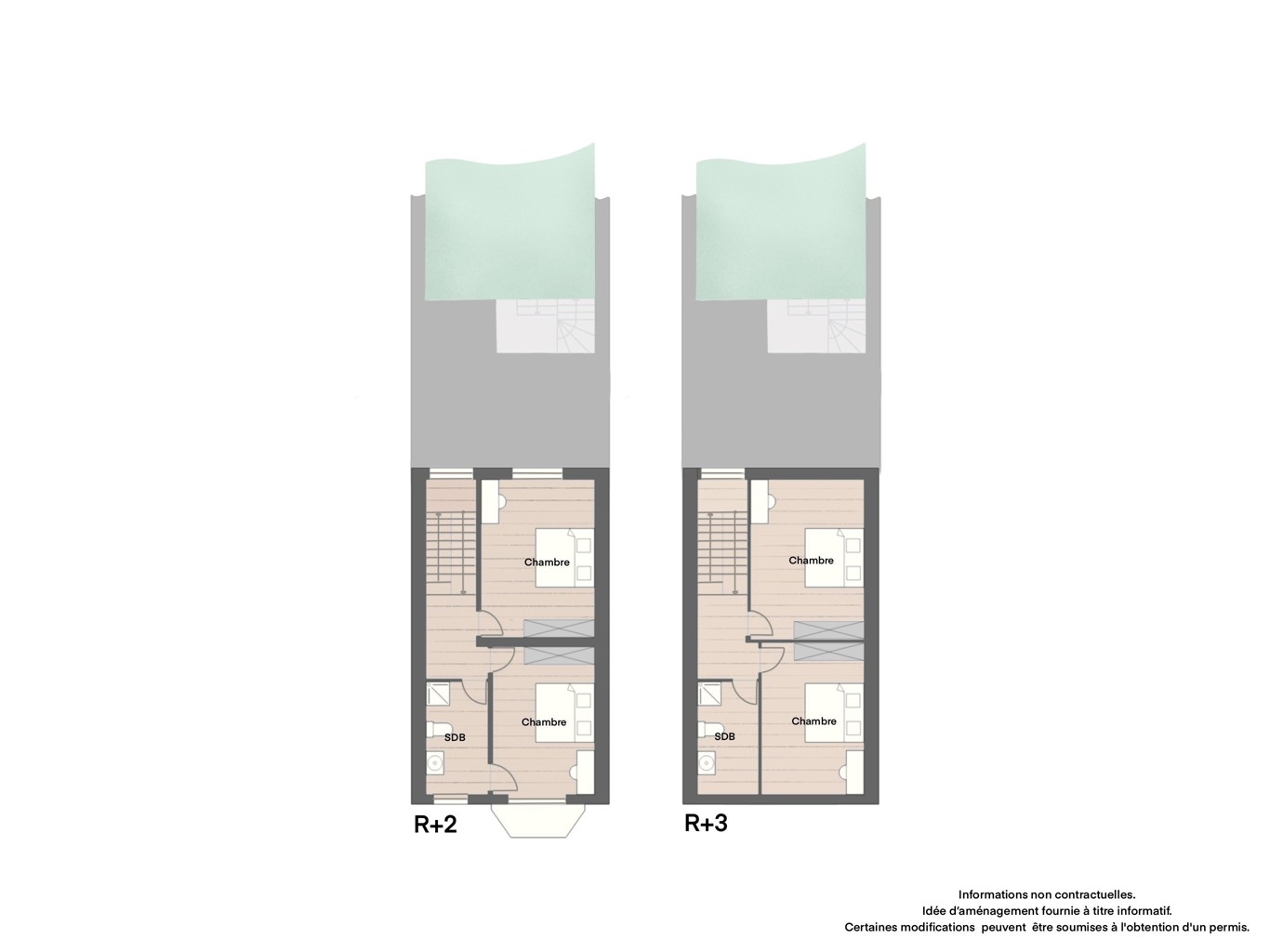 - 2ème étage: plateau de 61m² distribuant deux grandes chambres et un espace secondaire à envisager en future salle d'eau;